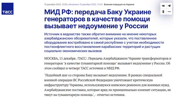 МИД РФ: передача Баку Украине генераторов в качестве помощи вызывает недоумение у России