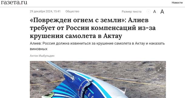 Вспомним скандал с самолётом, когда Алиев требовал извинений от России и от азербайджанской стороны лились хамские заявления в нашу сторону. Хотя потом выяснилось, что Россия не виновата в этой аварии, а виноват экипаж.