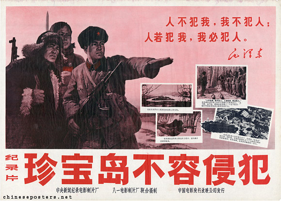 Мы предупреждаем клику советских ревизионистов-ренегатов: Мы ни в коем случае не допустим посягательств на территорию и суверенитет Китая. Пусть нас не трогают, и мы не тронем, а если тронут — мы не останемся в долгу. Безвозвратно ушло в прошлое то время, когда китайский народ оскорбляли. Вы еще хотите обращаться с великим китайским народом так, как с ним обращалась в свое время царская Россия. Это же слепота, это бред средь бела дня. Если вы будете продолжать военные провокации, то непременно получите суровое наказание. Сколько бы вас ни пришло и с кем бы вы ни пришли, мы решительно, окончательно, начисто и полностью уничтожим вас. 700-миллионный китайский народ и Народно-освободительная армия Китая, вооруженные маоцзэдунъидеями и закаленные в Великой пролетарской культурной революции, сильны как никогда. Кто осмелится напасть на нашу великую социалистическую Родину, тот будет разбит наголову, стерт в порошок!