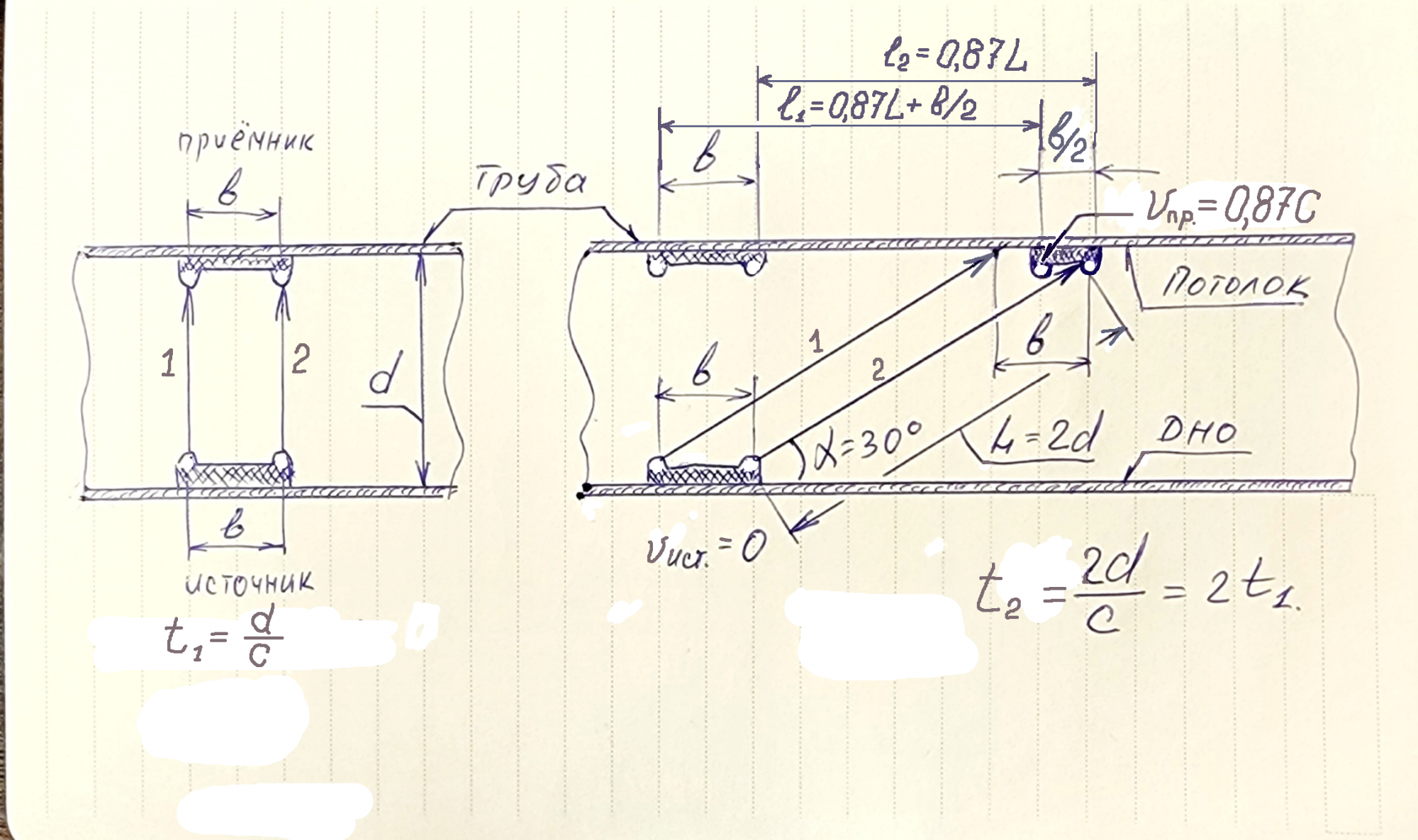 Ну, и наконец, самый сложный пример - уже с сокращением размеров (барабанная дробь). Пусть будет горизонтально расположенная труба, на дне которой есть два неподвижных синхронных источника лазерных световых импульсов, расположенных на некотором расстоянии друг от друга. На потолке два фотоприёмника, расположенных так же на таком же расстоянии друг от друга, и могущих синхронно перемещаться по потолку.