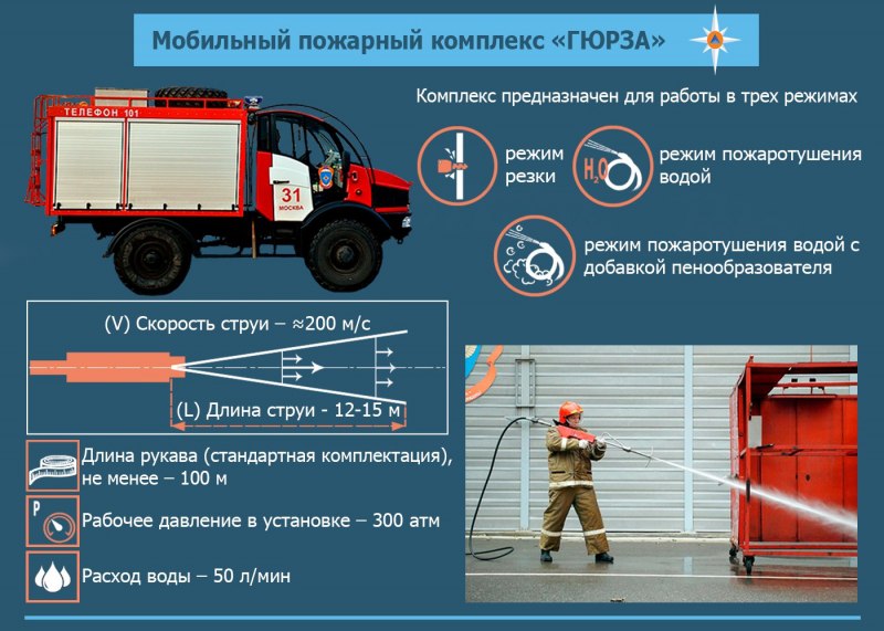 А вы знали, что у нашего МЧС есть специальная техника, выдающая водяную струю под давлением в 300 атмосфер? Она предназначена для резки конструкций из высокопрочных материалов. Струя воды имеет скорость выхода 200 м/с и достигает расстояния в 15 метров. Это в режиме резки. В режиме пожаротушения 40 метров.