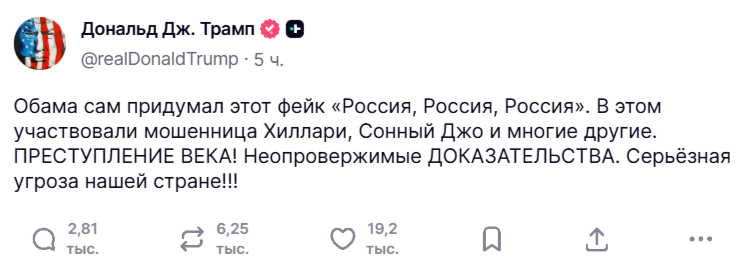 Сейчас глава национальной разведки США Тулси Габбард заявляет, что налицо предательство в высших эшелонах власти США и прямо обвиняет бывшего президента Барака Обаму в сговоре против Трампа.