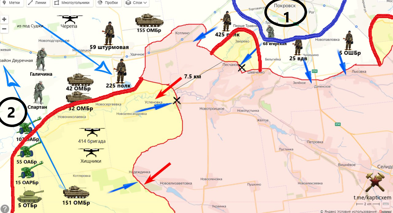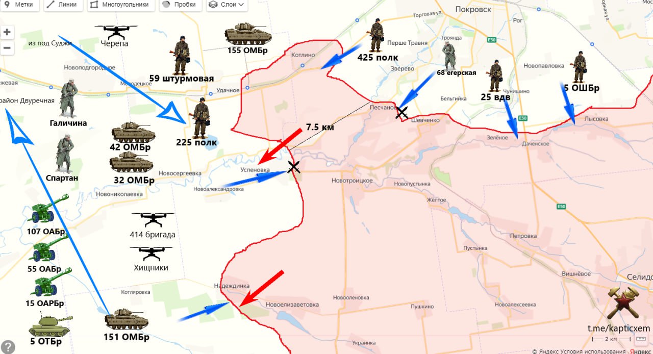 Идет продвижение у Зверево и северо-восточнее Лысовки. Мы подходим непосредственно к оборонительным рубежам города с юга, а с востока идет обрезание логистики. Покровск может начинать обратный отсчет. Крич будет доволен-)))