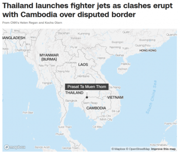 Территориальные конфликты с Камбоджей усилились после 15 июня, там было заседание совместной комиссии. Спорят о 4 районах, ни по одному не договорились. Последний договор о демаркации от 1907 года, далее только меморандумы и прочее "стороны договорились и дальше договариваться". Камбоджа тянет в международный суд, Таиланд хочет порешать по понятиям (и в свою пользу).