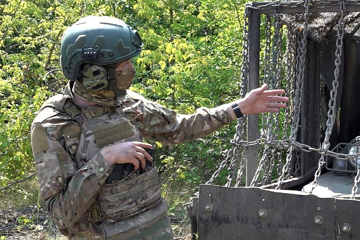 Сверху на «мотолыгу» водружён так называемый «мангал» - стальная конструкция, которая первой принимает на себя удар дрона. Кумулятивная струя, как правило, до брони просто не долетает и рассеивается. Этот «мангал» затянут сеткой по сезону - такое сочетание цветов называют «крым» - пыльная, выгоревшая трава середины-конца лета, почти без зелени. Я замечаю: «цвет подобран со вкусом». «Кореец» подтверждает – вражеские дроны не заметили его в лесопосадке, где он отстаивался.