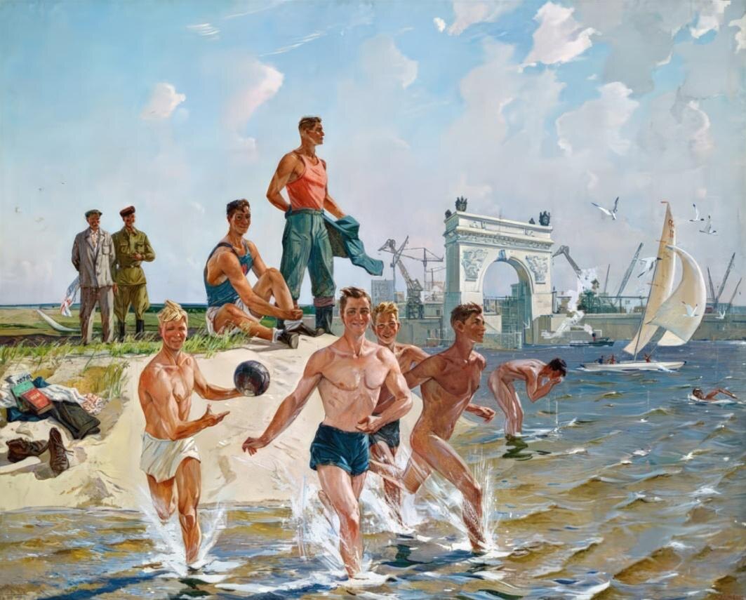 Че-то я не помню в советское время чтобы на каком-нибудь пляже, тем более на таком понтовом ( в порту, значит городской пляж) мужики без трусов бегали.. Зачем Дейнека такое сделал, цель ? Раскрепощенные донельзя сотрудники.. Ну и конечно бригадиры полянку пасут.. )) Стоят потеют, но четко в поле зрения держат... А так ребята на физкультуре, грудаки подкачанные на турнике, все как один 180 см и выше.. Но какой-то один дурак припер на пляж толстенную книгу.. похоже на художественное чтение, похоже вот этот в центре, морда у него как будто его вчера в кандидаты в члены партии приняли... ну и газета "Правда" аккуратненько лежит.. ))