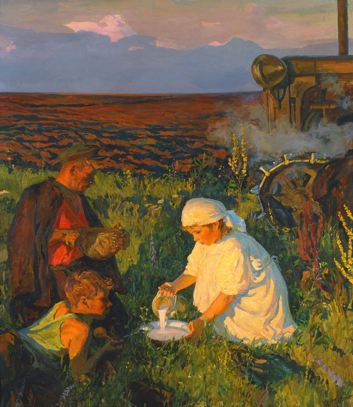 Сначала - самые известные картины, которые можно видеть даже в некоторых учебниках: "Сенокос", "Ужин трактористов", "На колхозном току" и др. Их автор - А.А.Пластов (1893-1972), народный художник и академик, Лауреат Ленинской и Сталинской премий.