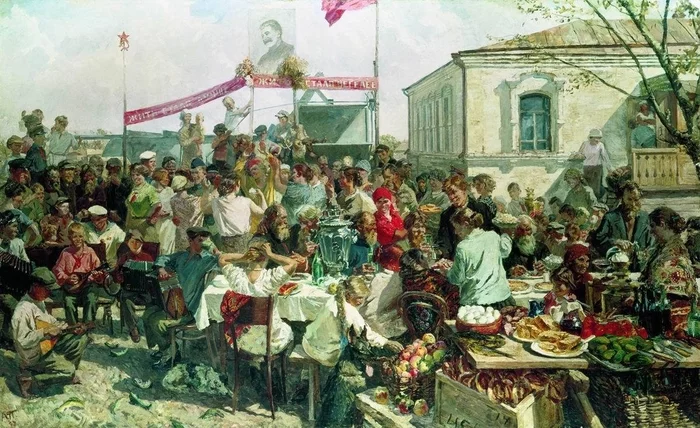 Если хотите - поставьте в комменты. Речь в прошлом обсуждении была о том, отражена ли частная жизнь и житейские радости в работах советского времени (видимо, кто-то думал, что - нет) или художники живописали исключительно трудовой героизм и официальные мероприятия. Поэтому колхозный праздник здесь присутствует в более неформальном виде.