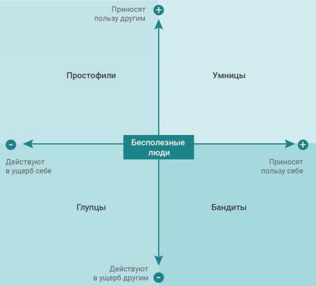 Третий основной закон предполагает, хотя и не заявляет об этом прямо, что люди делятся на четыре основные категории: простаки, умники, преступники и глупцы.