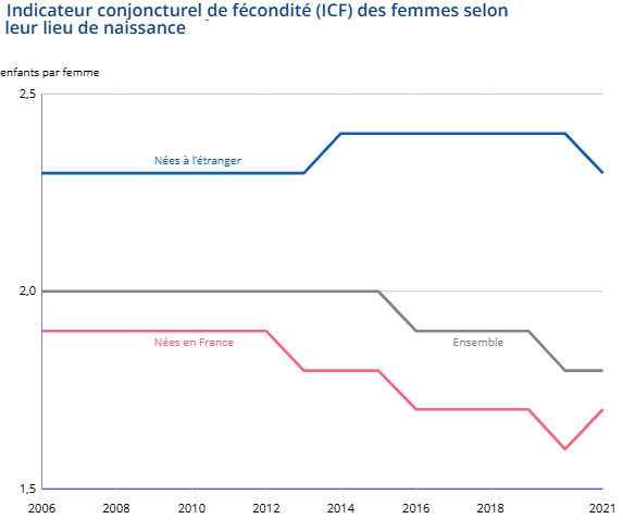 В настоящее время суммарный коэффициент рождаемости (СКР) в ЕС составляет - 1,3*, однако во Франции он гораздо выше - 1,62*. Европа прошла демографический крест в 2023 году (число умерших стало выше числа родившихся детей), а Франция получит свой крест в 2026 году (ООНПизон и Тулемон**).