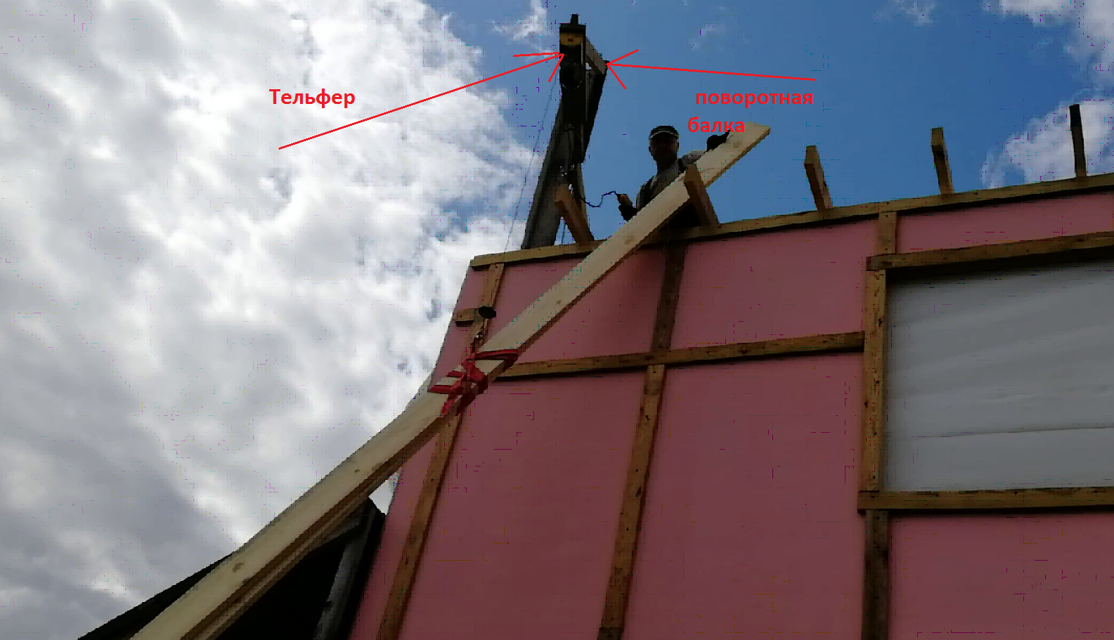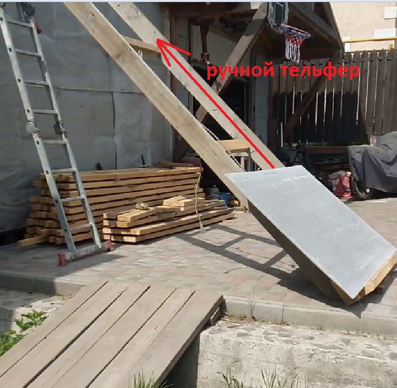 Хорошо было на бумаге, но потом начались овраги по реализации идеи. Бюджет не резиновый. Что стелить на пол крыши? Идеально это- пару слоев влагостойкой фанеры в общую толщину 25-27 мм. Ценник-конь, площадь крыши 70м2 ещё и мембрана «золотая» (обошлась с доставкой, 22ой год, в 121 000). Решил крыть пилёной доской, 150х40мм. Все стройматериалы заказал, ЭПДМ в Москве (фирма «Капелька»- самая дешевая в России, остальные перекупы от них). Пока ждали мембрану начали монтаж лаг- 200Х50х6000мм, доски тяжеленые, поднимать по наклонным доскам или просто на веревке, руки устанут через три доски. Напомню, строят «бабушка с дедушкой под шестьдесят». Нанимать денег уже нет, все потратили на материалы. Подумал и решил купить сделать строительный переносной мини кран. Снял из мастерской тельфер, сварил поворотную балку на гаражных петлях, закрепил эту конструкцию на, сколоченных Т-образно, досках 150х50. Прикрепил в удобном углу, уже готовых стен, второго этажа. Работа пошла бодро, жена внизу обвязывает доски стропами, цепляет. Я - на верху управляю тельфером и складываю доски на стенах второго этажа. На подъем досок лаг и крыши ушло два дня.