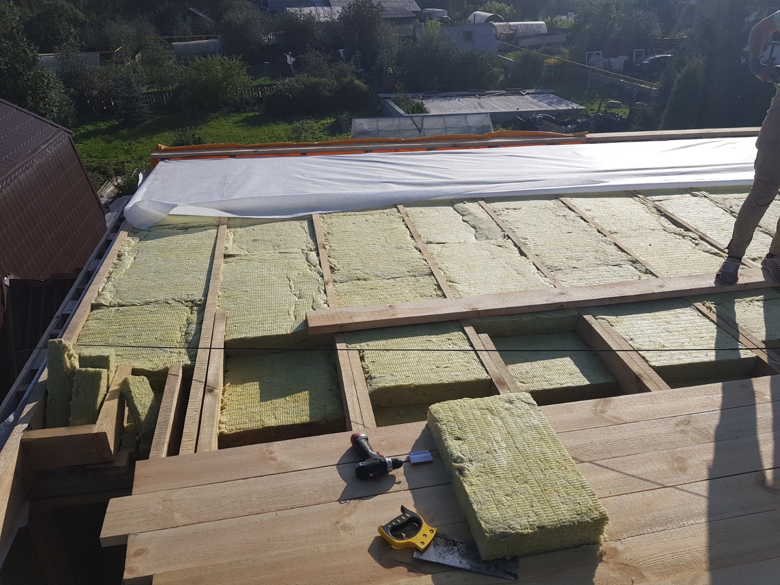 Не буду углубляться в подробности всего монтажа, думаю суть всем понятна, кратко: закрепили лаги по чертежу, натянули и закрепили мет. перфорированной лентой, снизу лаг, мембрану «Д», уложили утеплитель, закрыли утеплитель мембраной «А», прикрутили брусок 50х50 мм для вент-зазора, на него стали приколачивать доски пола крыши. Забыл про главный нюанс - плоскость крыши с уклоном! Уклон создается толщиной брусков вент-зазора. Уклон сделан в одну из сторон крыши, там предусмотрен слив – трапп. Что бы вся вода уходила в слив-трапп делаться контр-уклон из дополнительно, под углом к направлению слива, наколоченных досок. По всем краям крыши прикрутили на мощные металлические уголки доски (150х50мм) бортов чаши крыши. Поверх досок пола стелется, с проклейкой 88 клеем, мембрана. Края мембраны крепятся металлической перфорированной лентой из нержавейки на верхнею часть бортов-досок крыши. Дальше собрали будку крыши итд итп. Основные моменты, вроде, рассказал.