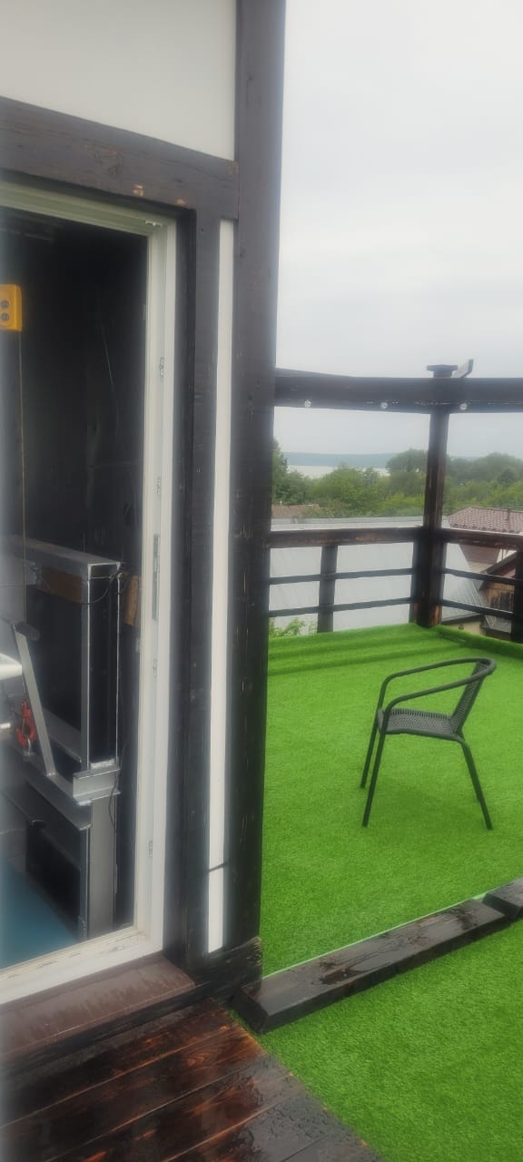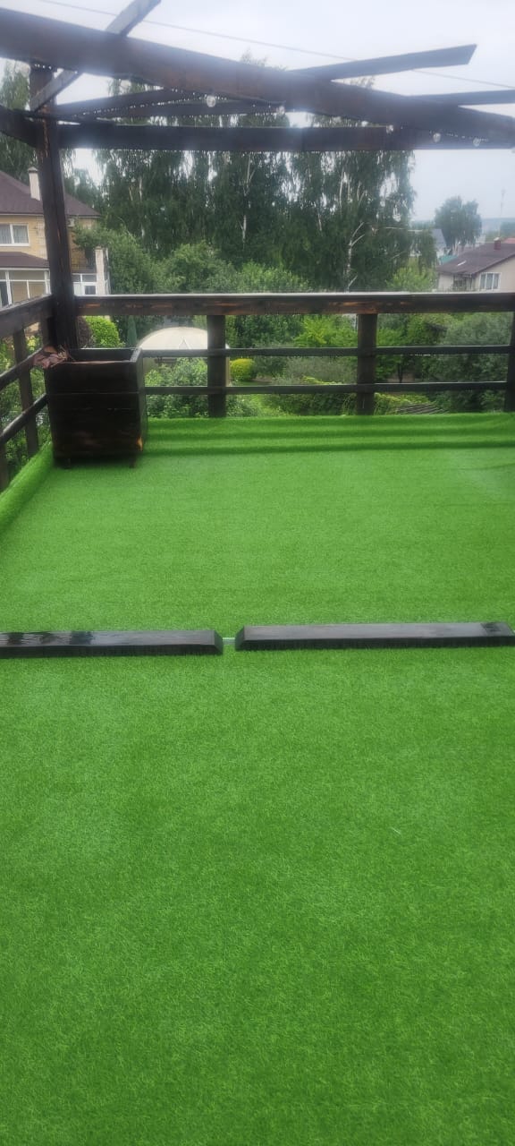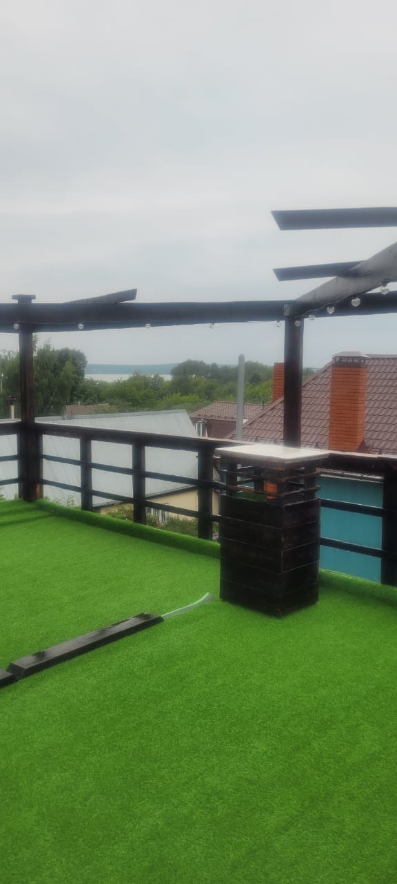 В этом году решили облагородить крышу, самым оптимальным вариантом после расчётов стоимости-качества стал вариант с искусственным газоном толщиной 24мм. Можно делать хоть натуральный с подкладкой из геотекстиля. Поднимали четырьмя частями, вес одной-35кг, на лифте. Расстелили, закрепили, как мембрану по краям. Сделали ограждение, освещение, декоративные элементы для скрытия не эстетичного вида будки ( как туалет в поле