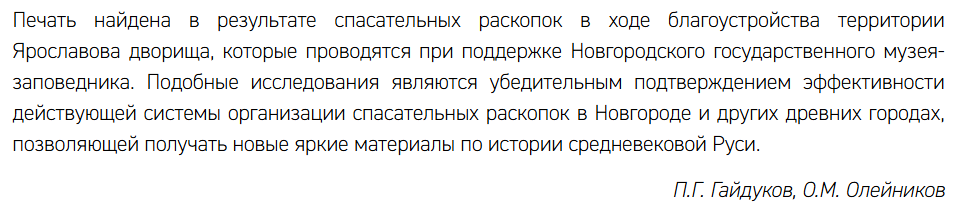 " Находка в Новгороде ранней печати Ярослава Владимировича, которая является одной из древнейших русских печатей, имеет чрезвычайно важное научное значение. Она дает дополнительную информацию о первом столетии существования Новгорода, что очень скупо отражено в письменных источниках. Благодаря материалам археологических раскопок история раннего Новгорода постепенно конкретизируется и проясняется"