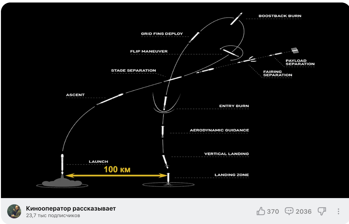 Вторая ступень летит дальше, а первая ступень делает кульбит, поворачивается соплами двигателей в противоположную сторону, гасит горизонтальную составляющую скорости до нуля и падает вниз, приземляясь в 100 километрах от старта.