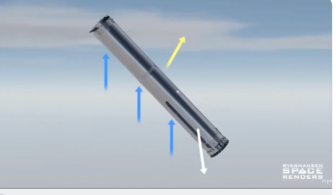 Все конечно понимают, что в стратосфере и мезосфере, на высотах 40-90 км над землёй воздушные решетчатые рули работать не будут. Лишь когда ступень опустится ниже 20 км, только тогда от этих рулей будет хоть какой-то эффект. Остаётся загадкой, как же ступень, падая, смогла пролететь до стартовой площадки 100 км с направленным вниз соплом?