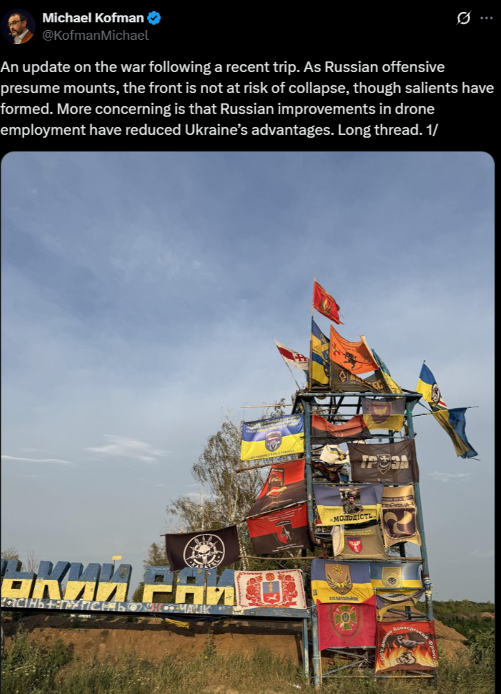 1 августа обновление информации о войне после недавней поездки. По мере нарастания российского наступления фронт не рискует обвалиться, хотя выступы уже образовались. Ещё более тревожно то, что российские усовершенствования в применении беспилотников уменьшили преимущества Украины.