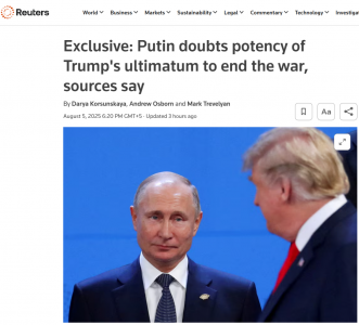 5 августа Reuters Эксклюзив: Президент России Владимир Путин вряд ли подчинится санкционному ультиматуму, который истекает в эту пятницу и который выдвинул президент США Дональд Трамп. Путин по-прежнему намерен полностью занять четыре области Украины, сообщили Reuters источники, близкие к Кремлю.