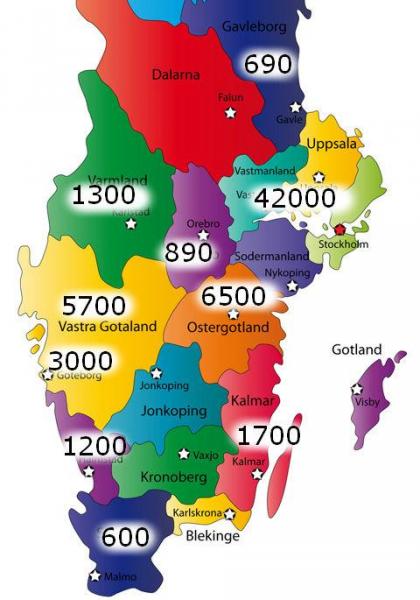 Данные на начало XI-го века. Самая населенная область Мэларен – 40 000 (по другим оценкам 45000). Восточный Гёталанд (Östergötland) предполагают 6500 человек, Западной Гёталанд (Västergötland) – 5700, Смоланд (Småland) – 7800, Халланд (Halland, юго-западное побережье) – 1200, Бохуслен (Bohuslän, севернее Халланда в районе современного Гётеборга) – 3000, Блекинге (Blekinge, небольшая часть южного побережья, к востоку от Сконе) – 600, Эланд (Öland, остров, вытянувшийся вдоль юго-восточного побережья Швеции) – 1700, Дальсланд-Вэрмланд (Dalsland-Värmland, самый запад Средней Швеции, на границе с Норвегией) – 1300, Нэрке (Närke, в центре Средней Швеции, известна как часть Свеяланд, с юго-востока граничила с Восточной Гёталанд) – 890, Хэльсингланд (Hälsingland, к северу от Уппландии, упоминается Адамом Бременским как область, расположенная к северу от свеонов и населенная скридфиннами, т.е. саамами) – 690.