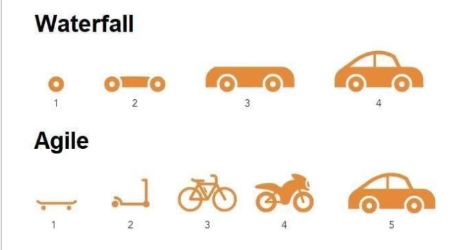 В книгах по аджайлу очень любят приводить картинки, сравнивая ватерфол и аджайл и показывая, какой классный скрам, как он здорово позволяет уже на ранних этапах разработки «пользоваться велосипедом», а потом сделать «прекрасный автомобиль».