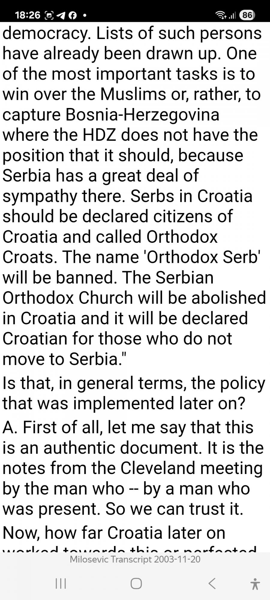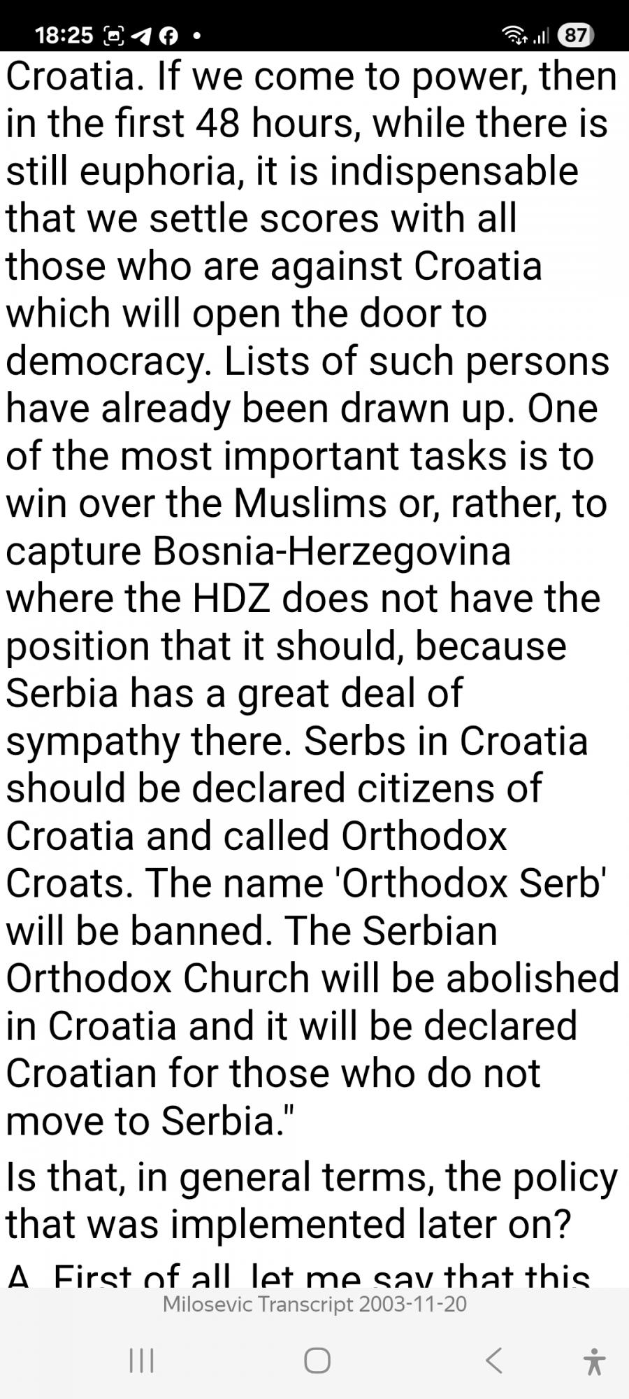 - Наша главная цель отделить Хорватию от Югославии. Если мы придём к власти, то в первые 48 часов, пока ещё царит эйфория, мы обязательно сведем счёты со всеми, кто выступает против Хорватии. Списки таких лиц уже составлены. Сербы в Хорватии должны быть объявлены гражданами Хорватии и называться православными хорватами. Название "православные сербы" будет запрещено. Сербская православная церковь будет упразднена- она будет объявлена "хорватской" для тех, кто не переедет в Сербию.