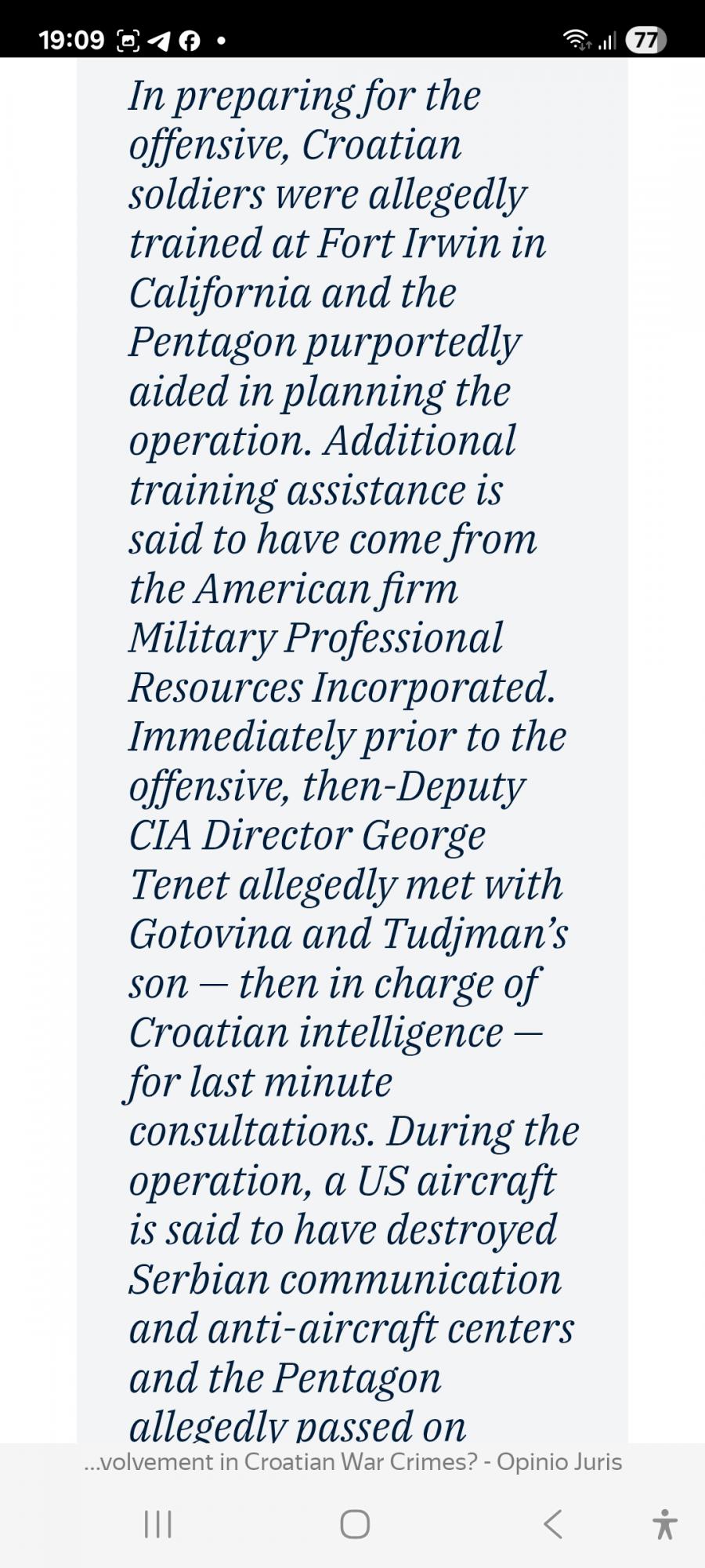 "В рамках подготовки к наступлению хорватские солдаты проходили подготовку в Форт-Ирвине в Калифорнии, а Пентагон помогал в планировании операции. Поддержка США выходила далеко за рамки того, что они публично признавали, а именно того, что хорватские войска просто проходили учения, проводимые американским частным военным подрядчиком MPRI.