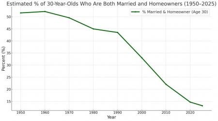 ▪️Известный американский писатель и журналист Марк Эймс комментирует (https://x.com/MarkAmesExiled/status/1952159551702327595) график, представленный членом конгресса США Марджори Тейлор. Количество 30-летних американцев, состоящих в браке и имеющих собственное жильё, катастрофически падает с 1991 года — с 44% до текущих 12%