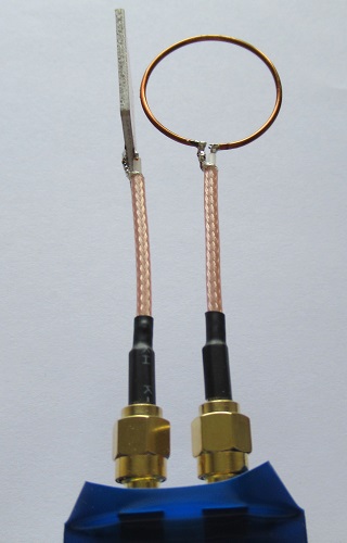 Я использую в своем эксперименте проволочную рамку диаметром 27 мм (диаметр проволоки 1 мм) и конденсатор с размерами 25×25×1,5 мм, изготовленный из фольгированного стеклотекстолита (рисунок 10). Работоспособность этих датчиков я проверил при помощи TinySA.