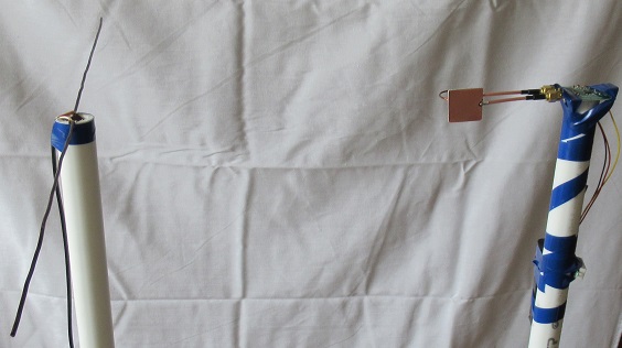 Диполь я установил на алюминиевый фотографический штатив, у которого последняя секция заменена на кусок пластиковой водопроводной трубы длиной 0,5 м, а фазовый детектор – на другой точно такой же штатив, у которого последняя секция также заменена пластиковой трубой (рисунок 12). Диполь и детектор прикреплены к трубам при помощи изоляционной ленты.