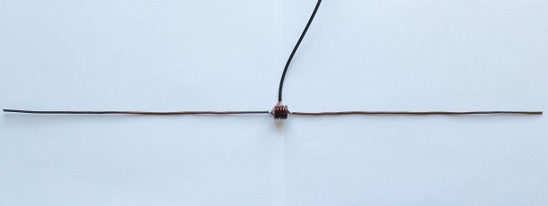 Диполь я изготовил из медной эмалированной проволоки диаметром 2 мм. Длина каждого плеча диполя составляет 235 мм, в середине диполя – спираль, содержащая 5 витков (рисунок 8).