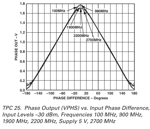 Как можно видеть из рисунка 6, разработчики микросхемы AD8302 почему-то выбрали «перевернутое» отображение сдвига по фазе: нулевому сдвигу соответствует максимальное значение выходного напряжения величиной 1,8 В, сдвигу на 90 градусов – напряжение величиной 0,9 В, а сдвигу в 180 градусов – напряжение 0,03 В.