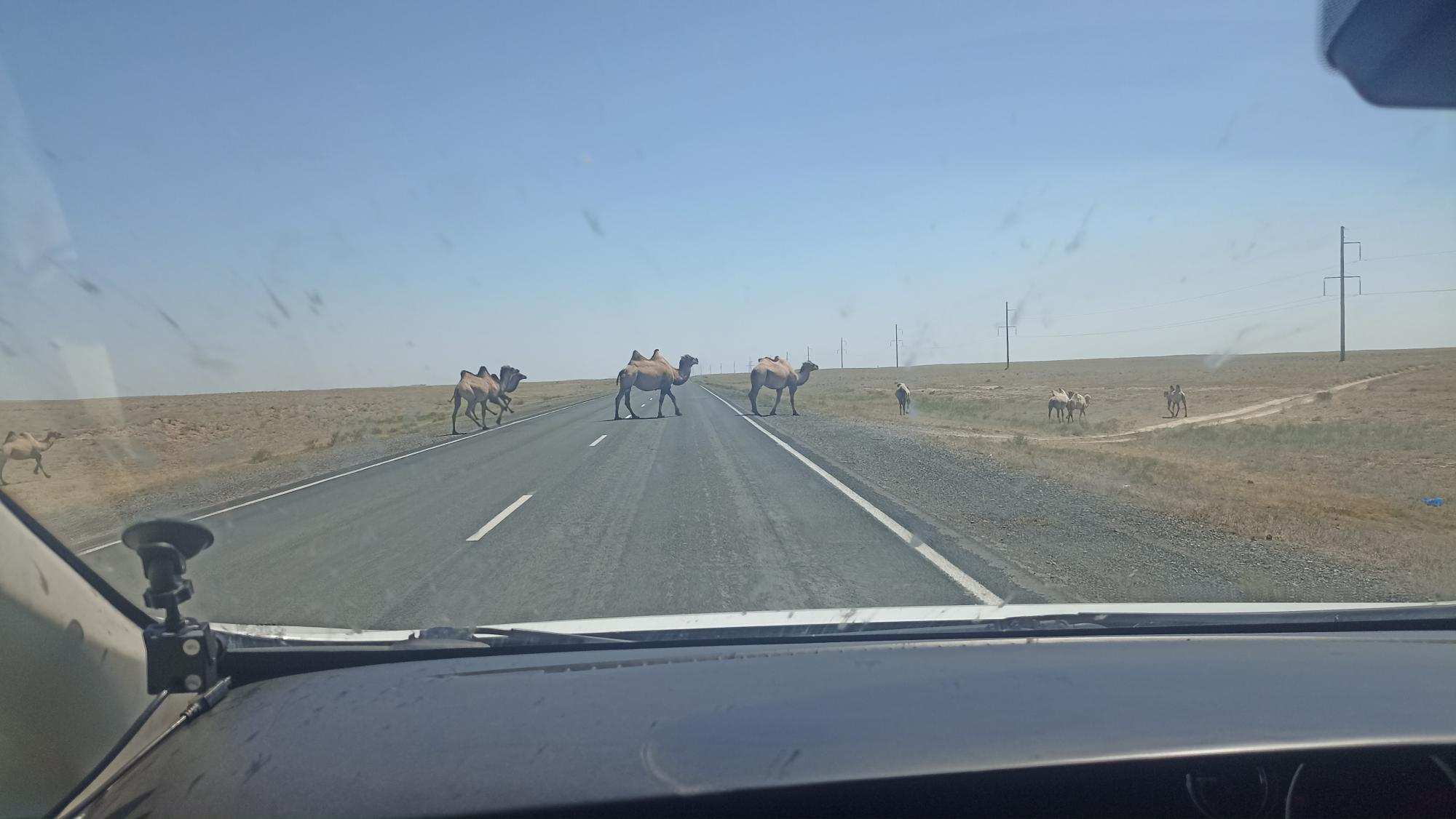 После Атырау, когда выезжаешь на Актау дороги просто песня. Ровные и без выбоин. Их как-будто линейкой в степи прочертили. Едешь 125км/ч и время от времени обгоняешь грузовики. Просто отдых. Если бы не верблюды)