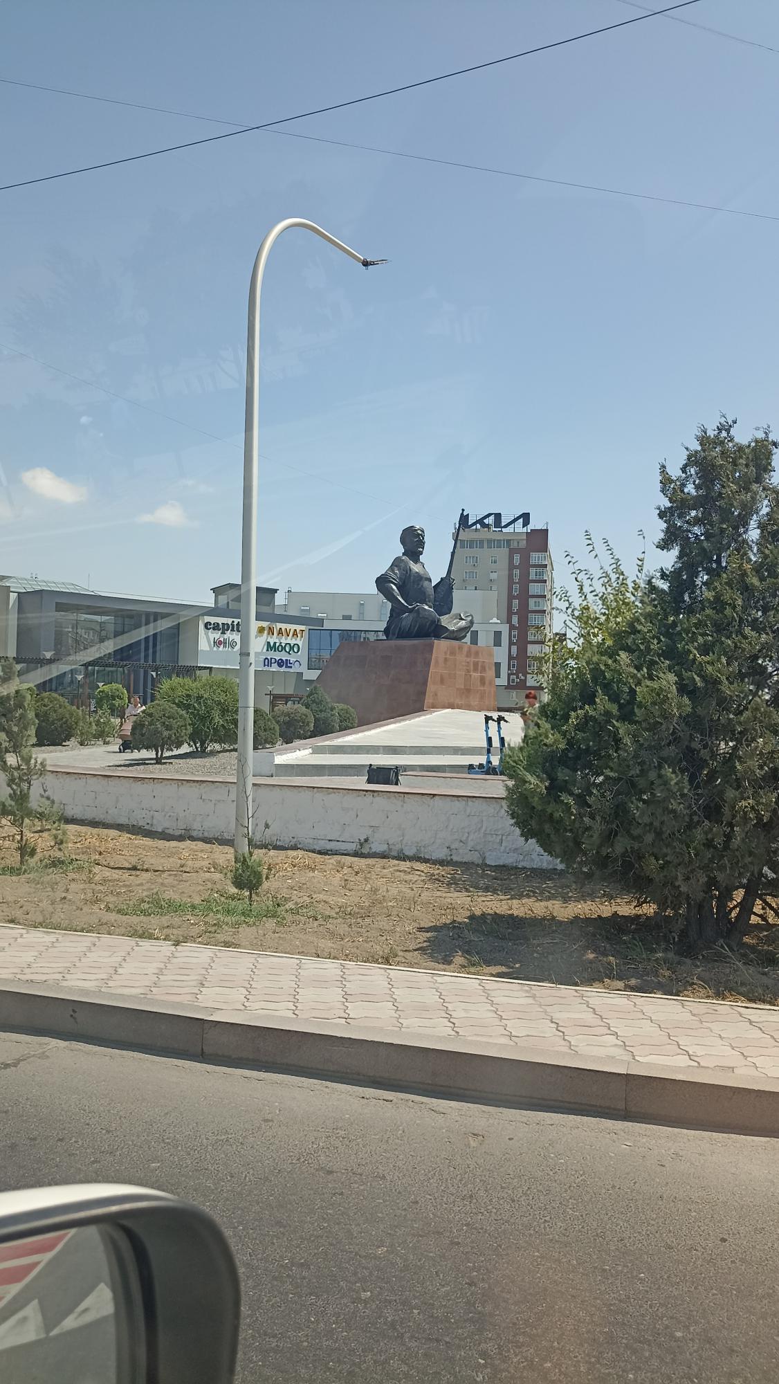 Там поставили памятник их акыну Кашагану, сказителю и сочинителю эпосов в 1989г. Великий акын стоял в полный рост. Но памятник был слишком мал по сравнению с постаментом и выглядел нелепо. А в лихие 90-е, памятник ночью исчез. Подозревают его сдали на цветмет. После этого памятник решили возродить. Долго решали в каком виде. На коне - так он не воин. На верблюде - дык опять на фоне верблюда потеряется. Да и бронзы на верблюда у города не было. В общем его посадили и он теперь сидит с домброй.