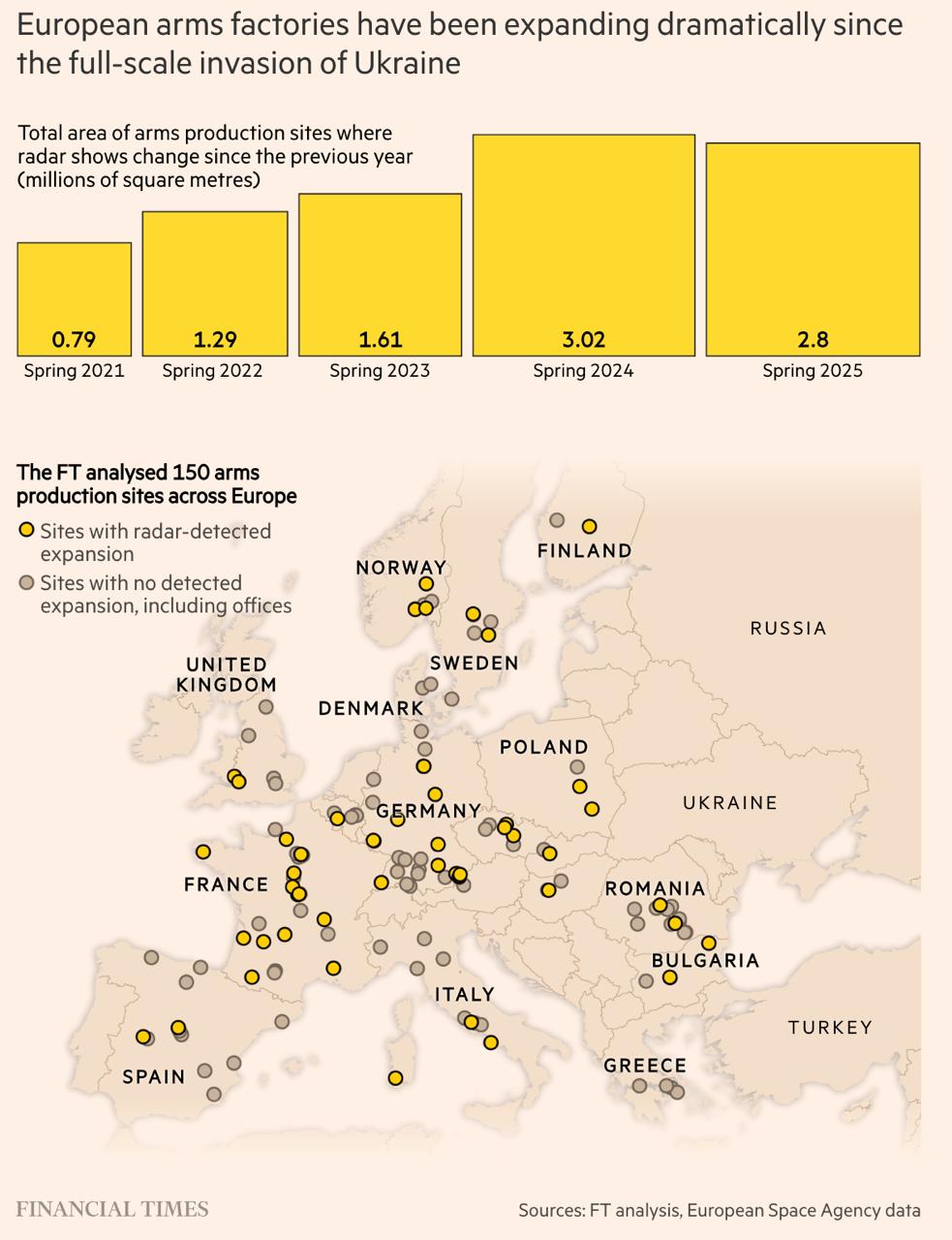 С начала войны в Украине военные заводы ЕС расширяются в три раза быстрее, чем в мирное время, охватывая уже более 7 млн квадратных метров новых промышленных площадей.