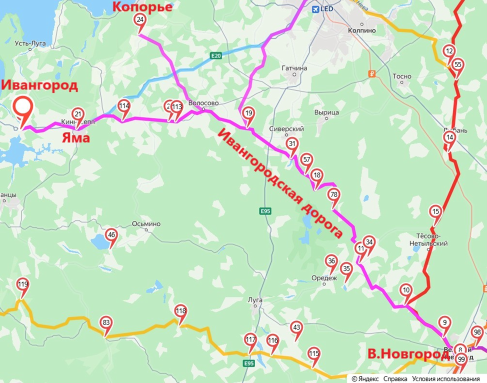 То есть, Бутурлин предлагает Делагарди создать видимость отхода шведских войск от Новгорода по ямской и копорской дороге. Под «ямской и копорской» дорогой, вероятно, имеется в виду Ивангородская дорога, соединявшая в 16–17 веках Ивангород с нынешним В. Новгородом и ныне несуществующая (1). По мнению историков, Ивангородская дорога проходила через город Яма (нынешний Кингисепп) и имела ответвление на Копорье (рис.4).