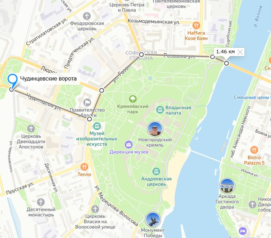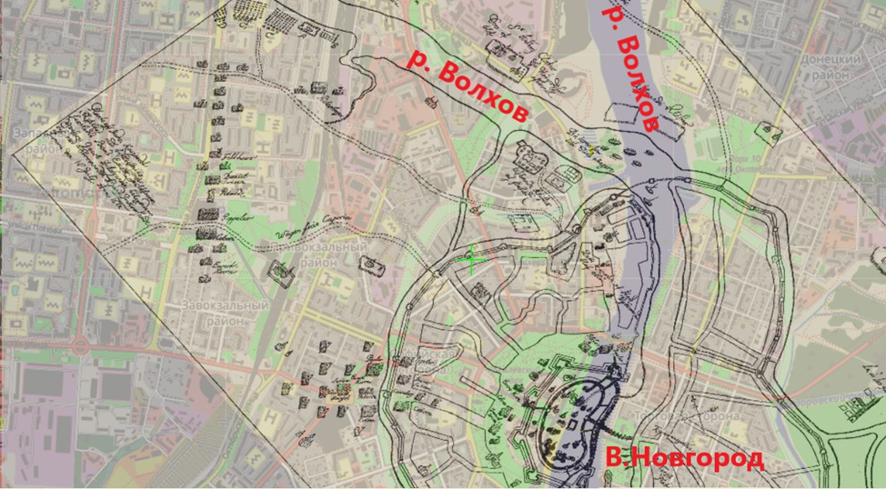 Рис.13. Расстояние от Чудинцевских ворот до р.Волхов на карте В.Новгорода.