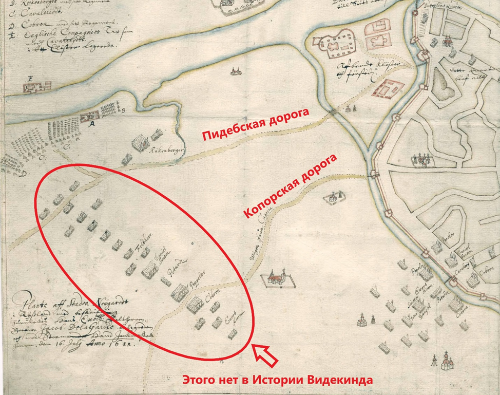 Но в описании взятия Новгорода Видекиндом не говорится о том, что Рекенбергер был выдвинут на Пидебскую дорогу. Питебская дорога в Истории Видекинда вообще не упоминается. О развертывании шведских войск фронтом на участке от Пидебской дороги до Водской дороги (она же Копорская или Ивангородская) в Истории Видекинда также ничего не говорится. Говорится, что роты шведских войск встали справа от Копорской дороги, а не слева, как следует из шведского плана осады Новгорода и комментариев академика Янина В.Л.