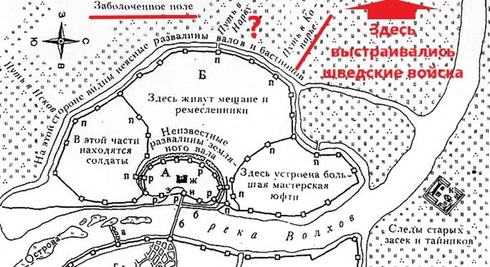 …К юго-востоку (востоку) от города, близ ручья, вытекающего из Волхова, велено было стать, развернув знамена, полковнику Реккенбергу с несколькими сотнями воинов (ротами)…(2, с.175-176).