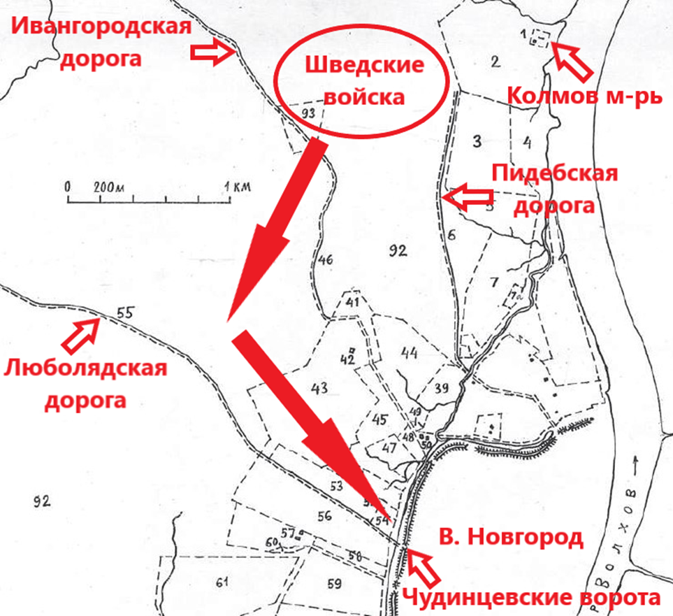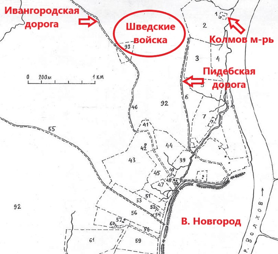 Согласно шведскому плану осады Новгорода в 1611 году и комментариям к нему академика В.Л. Янина фронт развертывания шведских войск на заболоченном поле между Пидебской и Копорской дорогами составил около 1 км (рис.10).