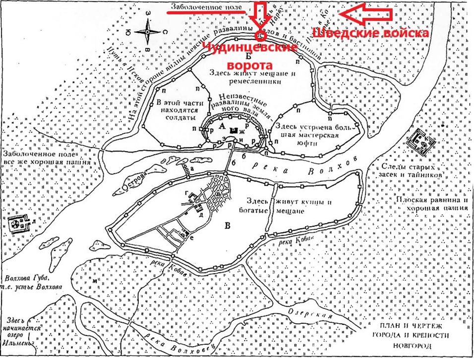 …Покончивъ все приготовленія къ приступу, Полководецъ (Якоб Делагарди - п.н.) притворился, будто хочетъ сделать нападеніе на городъ съ востока, съ другой стороны реки Волхова, где находился собственно купеческій городъ, въ которомъ было очень много богатства и где всего вероятнее предполагали нападеніе…(12, с.305).