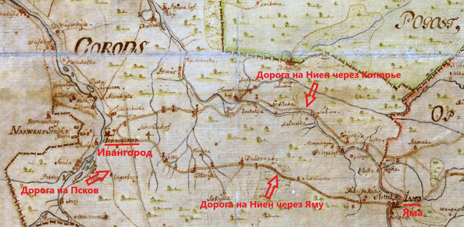 Здесь Видекинд снова упоминает Ивангородскую дорогу, которой нет на шведских картах Ингерманландии 17 века, только называет ее теперь "ведущей в Копорье". Читаем далее: