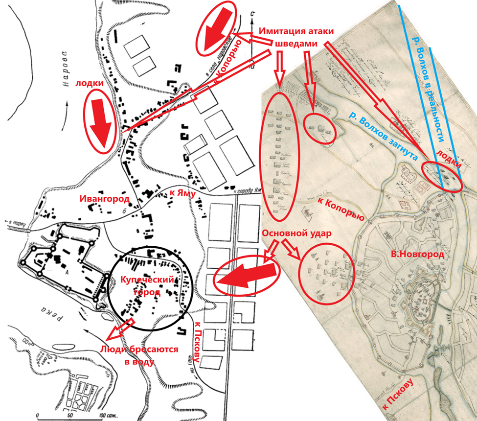 Но Видекинд упорно продолжает рассказывать об имитации шведами нападения с востока и северо-востока от Новгорода, хотя в тексте уже появляется и западная сторона.
