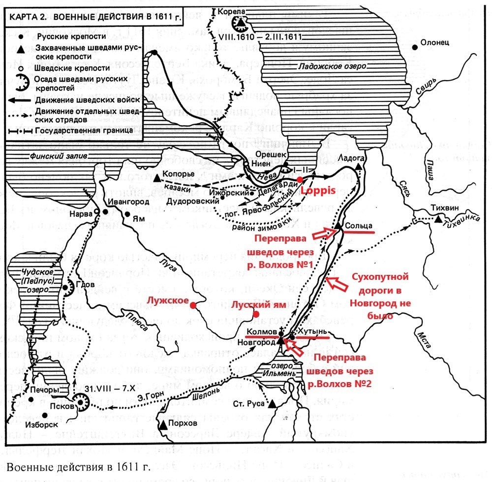 Редакторы Истории Видекинда не поясняют о каком Лузском идет речь. Можно предположить, что это бывший Лусский ям на Ореховской дороге, сегодняшняя деревня Лугско (7, с.91). Другой вариант, Лузский - это нынешний город Луга на одноименной реке, упоминаемый в писцовых книгах XVI столетия как сельцо Луское (1). В любом случае, судя по названию, это место должно находиться на реке Луге или в непосредственной близости к ней. Но Луское и Лугско находились в 30–90 км от нынешнего В. Новгорода и в стороне от принятого историками маршрута шведских войск Якоба Делагарди в 1611 году (рис.3). Непонятно каким образом Якоб Делагарди в июне 1611 года мог оказаться в селении Лузском и вести из него переписку, в то время как шведские войска находились в районе Хутынского или Колмова монастыря под Новгородом.