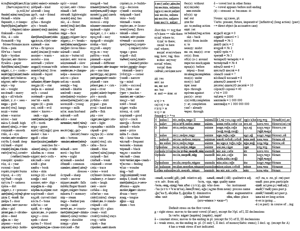392 морфемы можно выучить за один семестр при среднем темпе в 10 морфем за занятие. И хотя грамматика литературного русского языка весьма сложна, в случае базового уровня ПР все изучаемые морфемы вместе с используемыми правилами склонения, спряжения и ударения умещаются на одном форзаце (рис. 1). Этот форзац можно включать в каждую адаптируемую книгу.