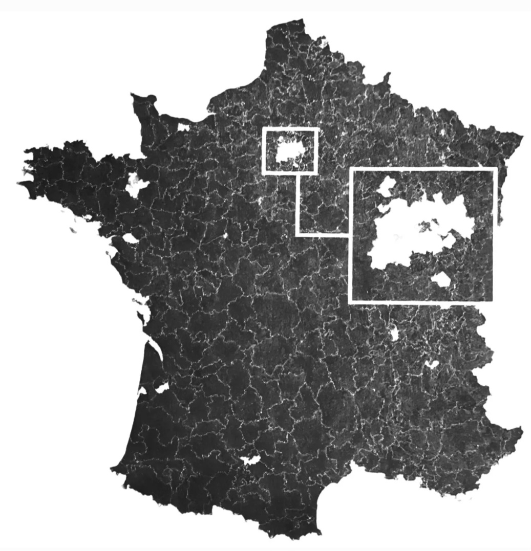 Наиболее наглядно это показано графически, как на карте выше, где черным выделены 457 французских избирательных округов, проголосовавших в первом туре выборов в Европейский парламент 2024 года за Национальное объединение Марин Ле Пен, в отличие от 119, выделенных белым цветом, которые проголосовали за другие партии. Аналогичные карты с использованием других прокси-серверов для измерения настроений, направленных против статус-кво, показывающие ту же схему географического распределения, можно было бы легко составить для Соединенных Штатов, Великобритании и других стран.