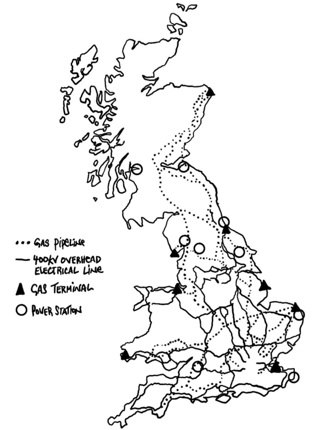 Во—вторых, это способ настройки современной критически важной инфраструктуры — газоснабжения, электроснабжения и транспорта. Опять же, проще говоря, все системы жизнеобеспечения городов расположены в сельской местности или проходят через нее. Ниже это легко проиллюстрировать упрощенной картой энергетической инфраструктуры Великобритании. Ни одна из этих инфраструктур не охраняется должным образом, более того, большую ее часть фактически невозможно должным образом охранять.