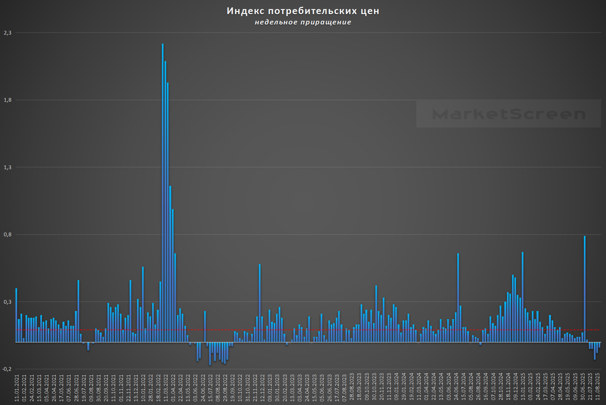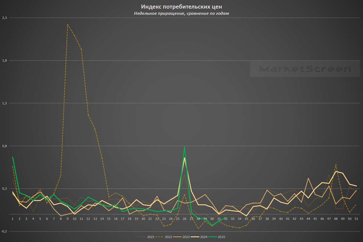 дуране посмотрела график инфляции с 2021 года. Вот например, график инфляции из этой статьи. Это приращение цен за неделю в %, а не сама инфляция.Что видим на графике в августе 2022, 2023, 2024 и 2025 года?