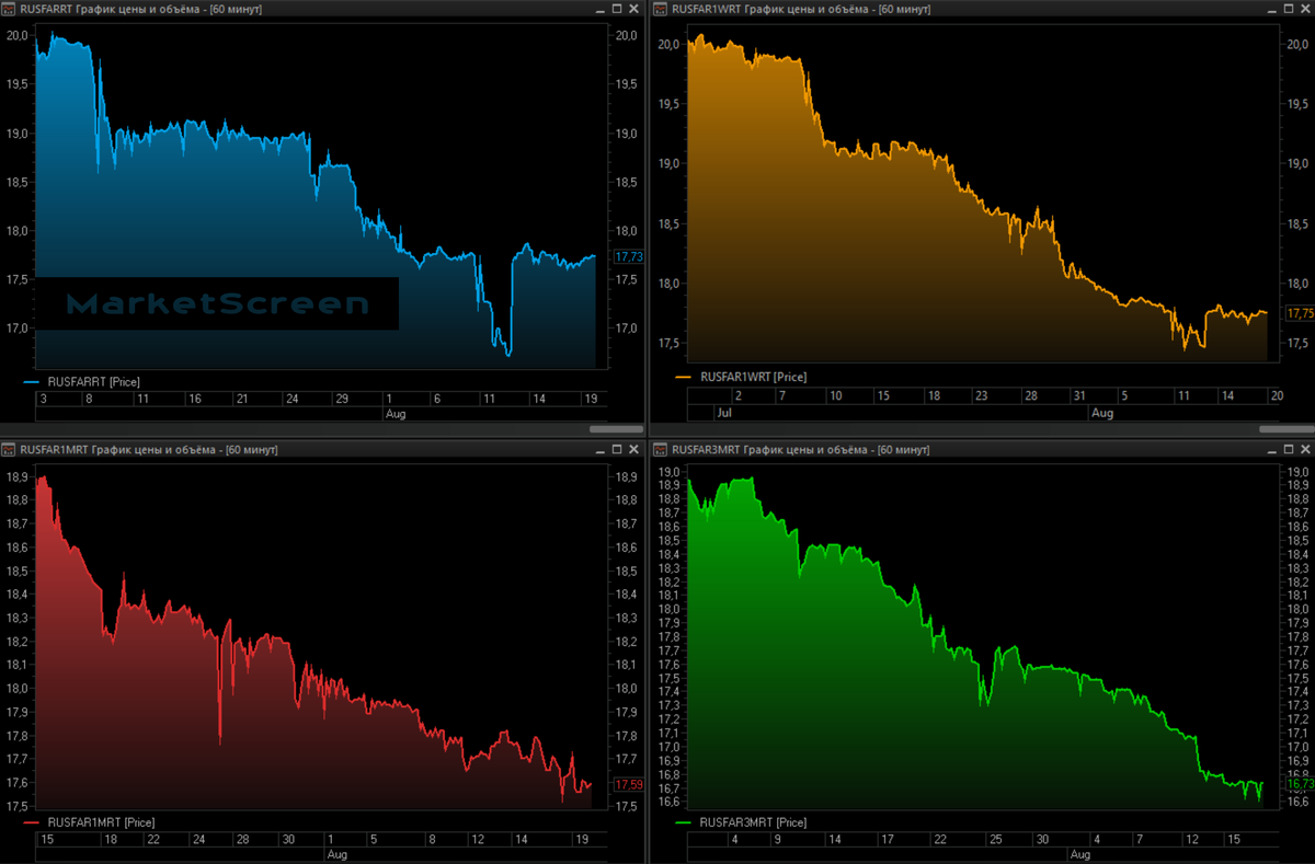 На что нынче рассчитывают крупные деньги? Для этого мы смотрим индекс RUSFAR, точнее на 4 индекса RUSFAR: овернайт, недельный, месячный и 3-месячный. Напомню, RUSFAR – это индекс биржевого денежного рынка. Справедливая стоимость денег. Рассчитывается на базе РЕПО с КСУ. Короче, средневзес по ставкам, по которым крупняк друг дружке деньги одалживает. Ну и всё это, понятно, пляшет от ключевой ставки.