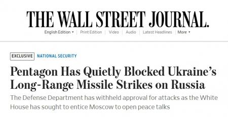 надо использовать точные формулировки...а не придуманные Wall Street Journal......пентагон блокирует использование дальнобойных ракет не Украине и не Киеву....а себе самому....потому что эти ракеты запускаются только при участии военспецов США....и с использованием данных разведки США...так что отмазаться от прямого участия в боевых действиях на территории БУ уже не получится....замазались по полной