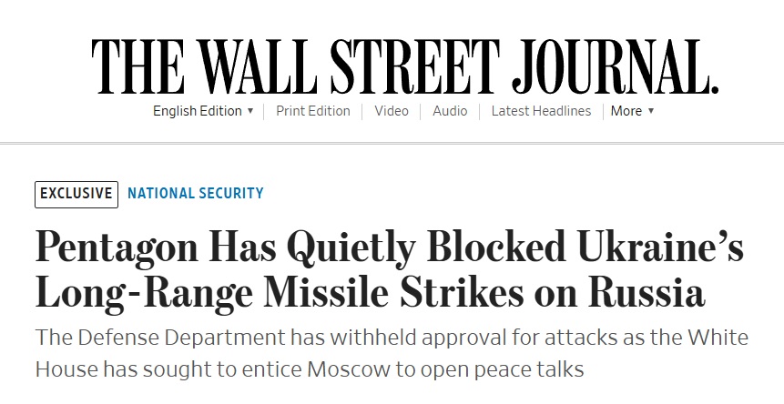 Эксклюзив The Wall Street Journal 23 августа: Пентагон в течение уже нескольких месяцев блокирует использование Украиной ракет дальнего радиуса действия для нанесения ударов по территории России, заявили американские чиновники, ограничивая Киев в использовании мощного оружия в борьбе с Москвой.
